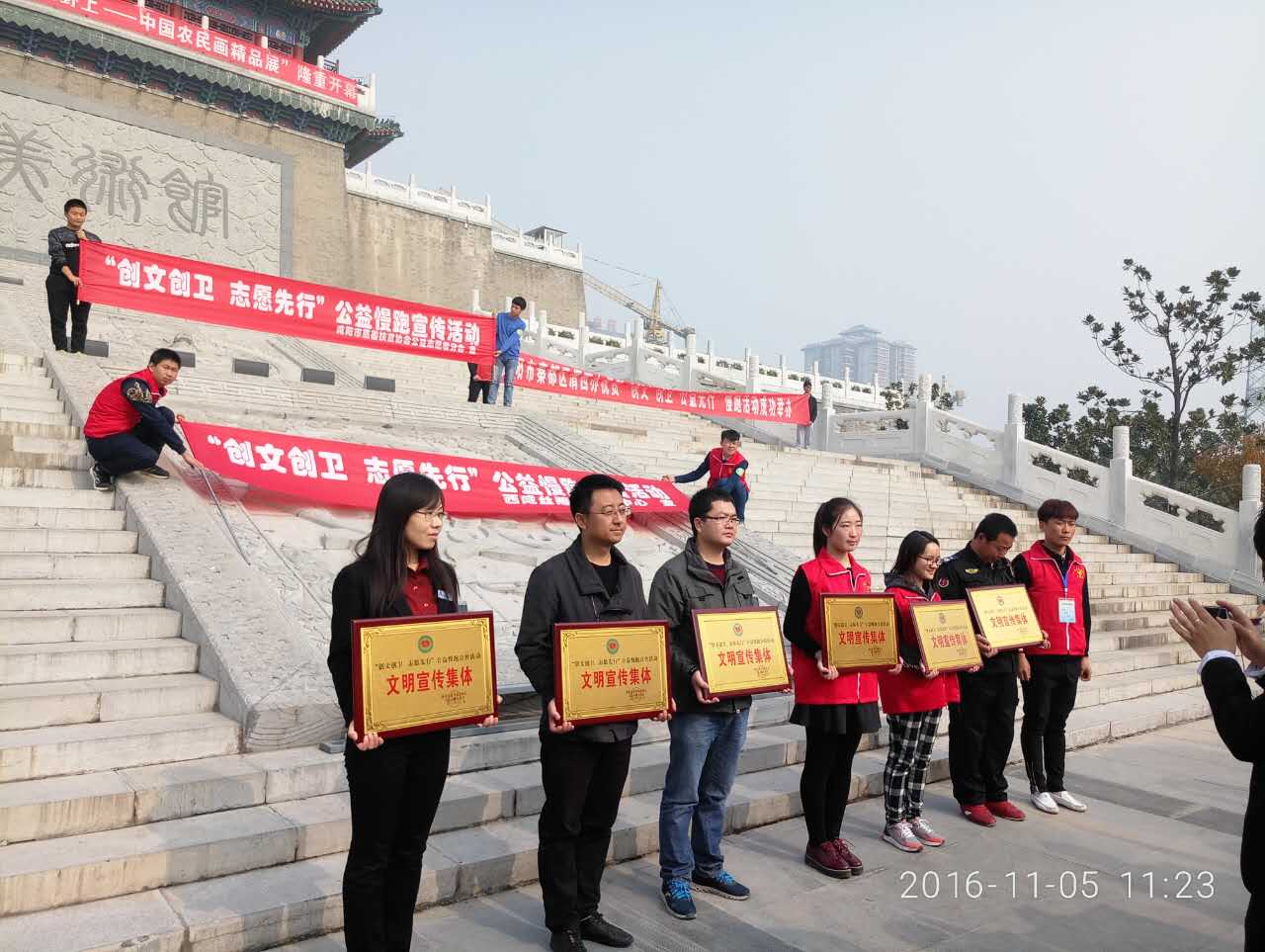 到達終點后,所有參與團體于在清渭樓前集合。城投集團志愿者服務隊代表領(lǐng)取了由咸陽市慈善扶貧協(xié)會公益志愿者分會頒發(fā)的榮譽證書,最后全體志愿者們合影留念,記錄下了這寶貴的一刻。