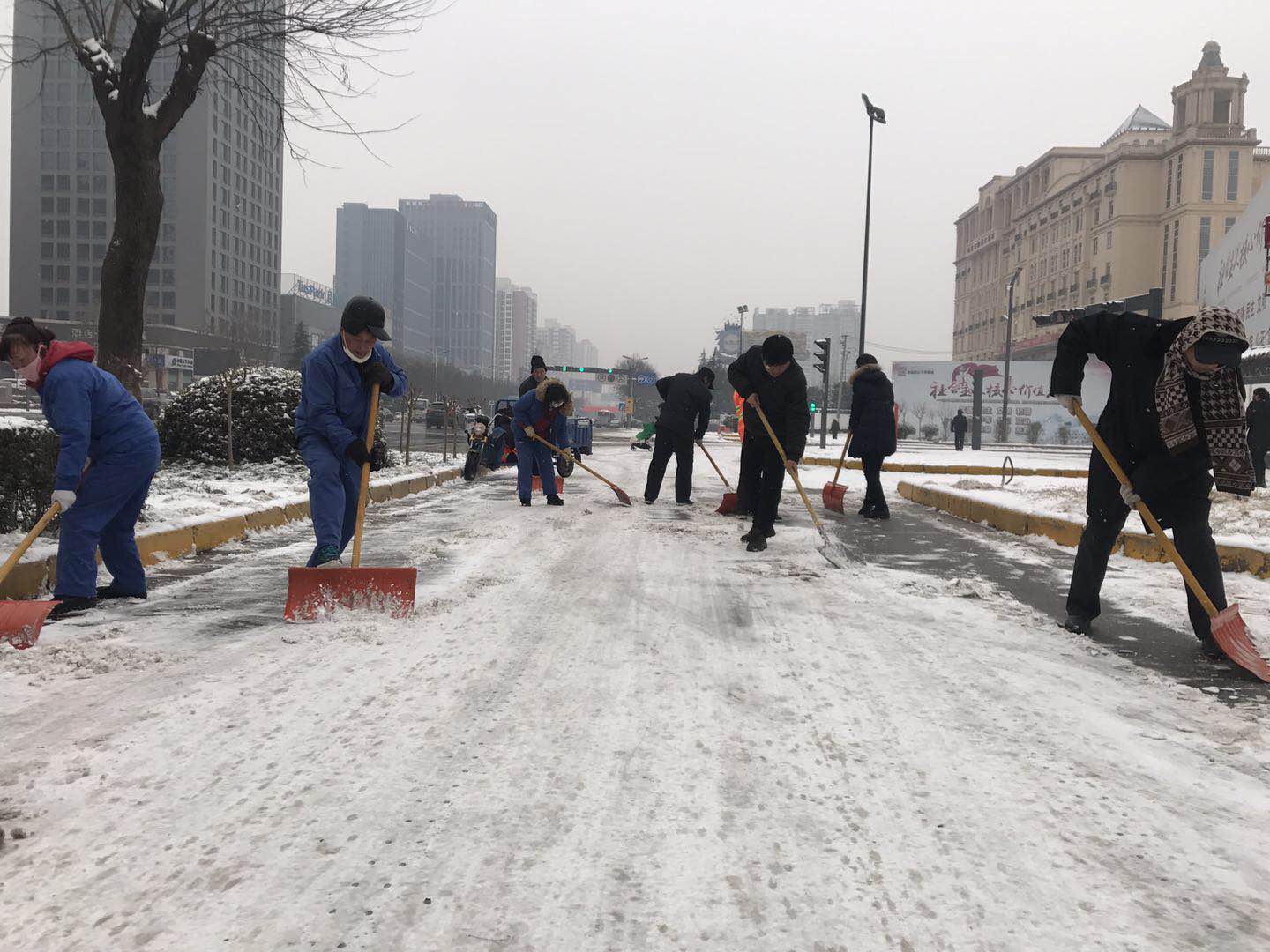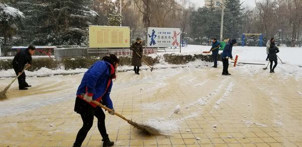 由于氣溫較低,主干道路的雪被壓得很瓷實(shí),清掃工作十分困難。天氣雖然寒冷,但是大家熱情高漲,即使手凍的通紅,也擋不住大家的干勁。都爭(zhēng)先恐后,團(tuán)結(jié)協(xié)作、井然有序,掃的掃、鏟的鏟,干勁十足,一心想著將路面的積雪盡快清除,經(jīng)過(guò)一天的奮戰(zhàn),基本將包抓路段、主干道積雪清掃干凈,確保了廣大居民、業(yè)主的出行安全。